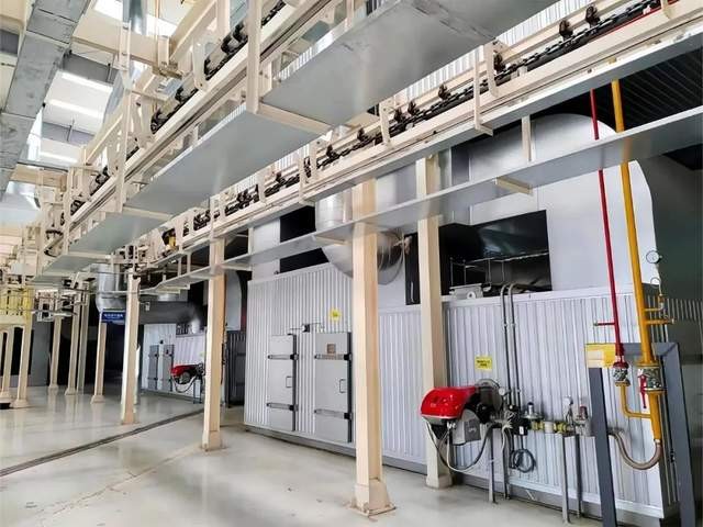 涂装D线由前处理电泳线、面漆线和喷粉线组成,主要从事零部件的涂装作业。具体工艺流程为:上件→热水洗→预脱脂→脱脂→水洗→锆化成膜(无磷前处理)→水洗→阴极电泳→水洗→电泳烘干→面漆/粉末喷涂→烘干→下件。涂装D线每小时可生产142挂零件,涂层漆膜性能检测标准完全按照日本井关规格执行,在同行业中处于领先水平。